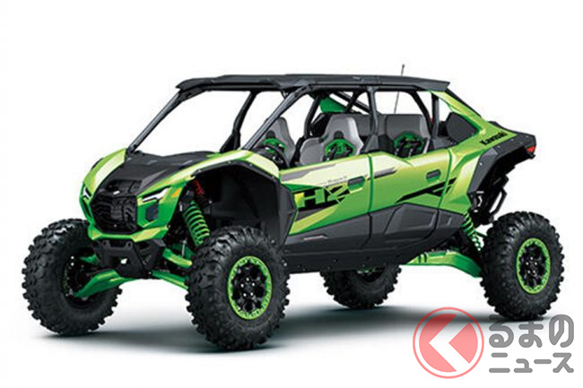 海外向けモデル「TERYX5 H2 DELUXE」は、カワサキ初となるスーパーチャージドエンジンを搭載したオフロード四輪車です。「TERYX H2」シリーズの上位グレードとなるこのモデルは、二輪車「Ninja H2」のスーパーチャージドエンジンを改良して搭載し、最高出力250HP、最大トルク198.3Nmを発揮します。CVT(無段変速機)との組み合わせにより、ダイレクトでリニアなレスポンスが楽しめるとのことです。