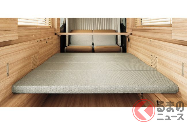 後部の車中泊用ベッドは、寝床以外にもアレンジが可能で、「折りたたみベッド」と、ワンアクションで展開可能な「MYROOM 跳ね上げベッド」(オプション設定)の2タイプから選択可能です。