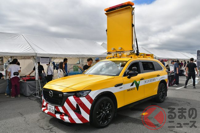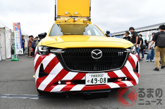 マツダの最新型「高性能パトロールカー」公開! 直列6気筒「3.3リッターターボ」搭載のハイパワーモデル! 鮮烈イエローもカッコいいNEXCO東日本の「CX-80 道路巡回車」に注目