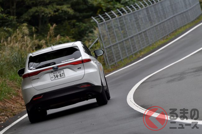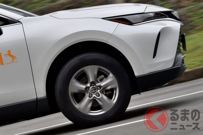 今回ハリアーに装着されていたのは65扁平(へんぺい)のタイヤでサイドウォールに厚みがありますが、ステアリング操作に対する応答は程よくリニアで、SUVという車形にあったレスポンスを見せてくれました。スポーツモデル主眼ならば話が別ですが、全高の高いSUVならばシャープなレスポンスだとかえって疲れてしまうと思うので、剛性感と応答性は程よい仕上がりでした。