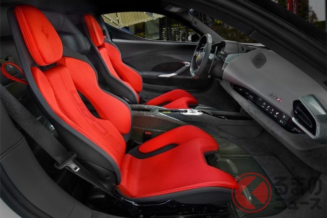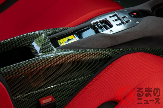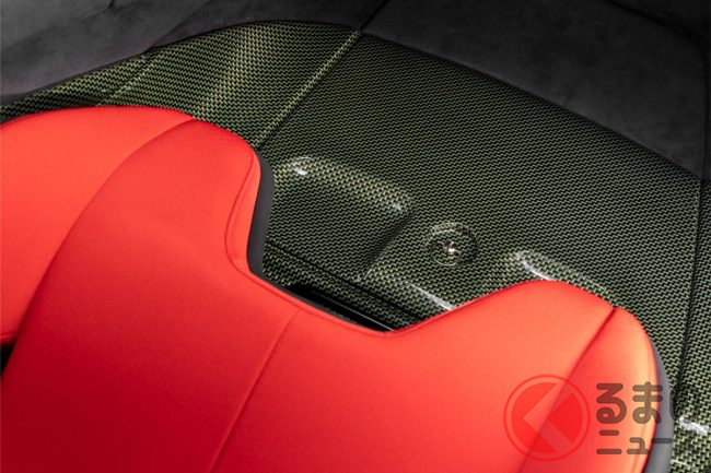 インテリアでは、往年のF40を想起させるケブラー素材を採用。カーボン・ケブラーがフロアやシート後部、センタートンネルに使われ、軽量性と剛性を両立しています。