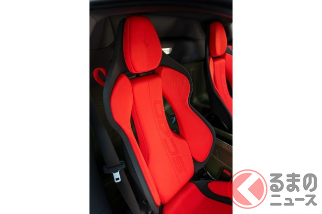 内装色はチャコール・アルカンターラとレッドのジャカードファブリックを組み合わせ、ヘッドレストには“SC40”ロゴと跳ね馬の刺繍を施しています。