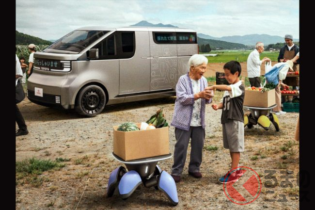 ジャパンモビリティショー2025では、「トヨタイムズ」の動画配信からも分かるようにカヨイバコの移動販売車が登場しそうです。動画配信では、カヨイバコに野菜を積み込み、そこから先のラストワンマイルを担う、足が4脚ついた椅子のような極小モビリティの画像も映し出されました。