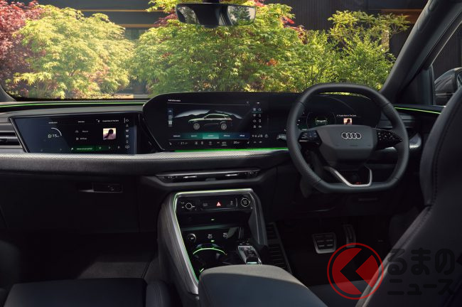 インテリアは、A5や「A6 e-tron(近々レポートします)」との共通点が多いデザインになっています。スリムなMMIパノラマディスプレイを備え、運転席前は11.9インチで中央は14.5インチとなり有機LEDにより湾曲しつつ連続感があります。