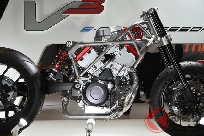 この新型エンジンは、2024年11月の「EICMA 2024(ミラノショー)」で初公開されたコンセプトモデルに搭載されていたもので、水冷75度のV型3気筒レイアウトと、モーター駆動の電動過給機という、二輪車においては前例のない構成を採用。