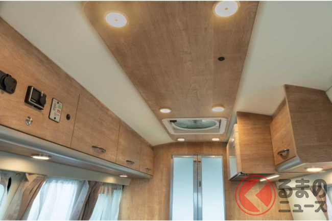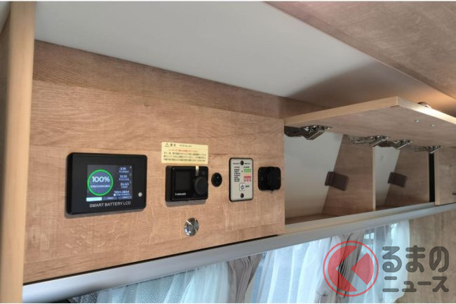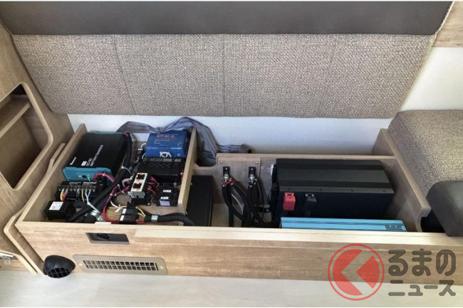 電装系も充実しており、300Ahのリチウムイオンバッテリーを中心に、2000Wインバーター、家庭用エアコン、電子レンジ、49リッター冷蔵庫、ソーラーパネルなどが標準装備されています。これにより、外部電源がない環境でも快適な生活が可能です。