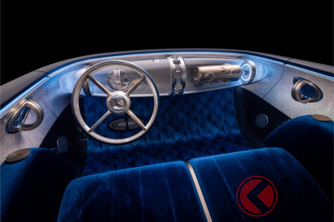 インテリアは“ラウンジ”を思わせる上質な空間で、伝説の「300SL」を彷彿とさせるベンチシートとエレガントなリアシートを採用。クラシカルな木目と透明素材を融合させたインストルメントパネルが印象的で、ディスプレイはシームレスにつながるデジタル構成を採用しています。