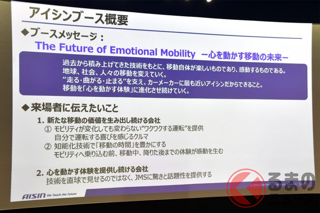今回のJMS2025でのアイシンブースは「心を動かす移動の未来」をコンセプトにしており、来場者に新たな移動の価値を感じてもらうことを目的に展示をおこないます。