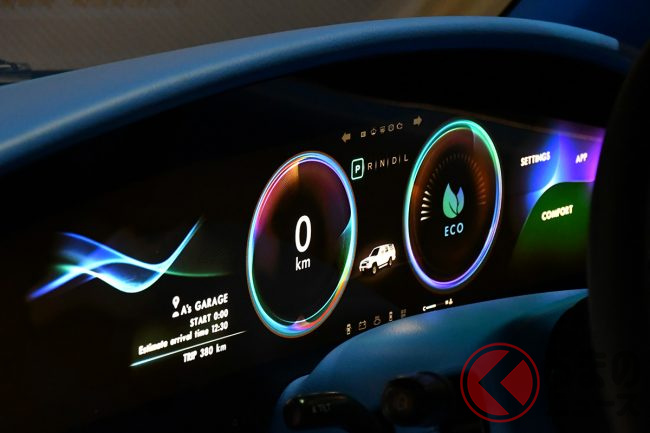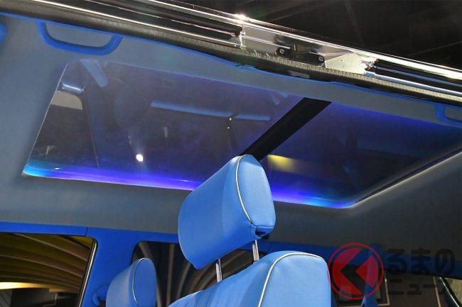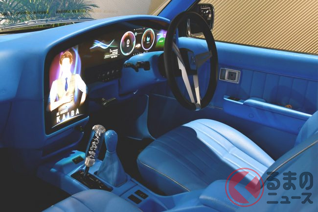 内装に関しても、シートやダッシュボードなどは全面的に「水色」のカラーで統一されており、メーターやインパネまわりは全面液晶タイプへと大きく変更されています。そこに埋め込まれたAIがドライバーや同乗者に対してセンシングやアシストをする機能もあり、社内のイルミネーション含めた統合制御がおこなわれるなど、ベース車両のトランスミッションはMT(!)でありながら、まさに過去と未来が融合する1台となっています。