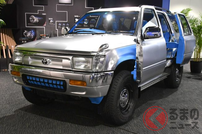 今回の事前説明会では、メインステージに展示・デモンストレーションをおこなう車両を先行で報道陣向けに公開しました。アイシンの将来技術が多く搭載された「博士の愛車」は、今となっては懐かしい2代目のトヨタ「ハイラックスサーフ」です。