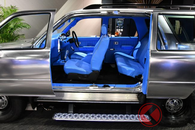 2代目ハイラックスサーフをベースにJMS2025ブースの展示用へと仕立てられた1台、「銀ピカ」な輝きをまとったシルバー外装に加えて、大きな注目はそのドアの開閉機能です。
