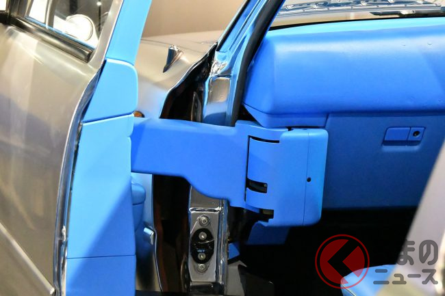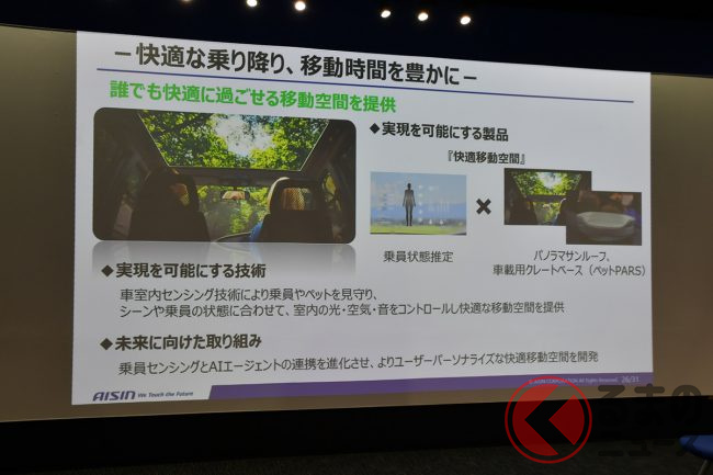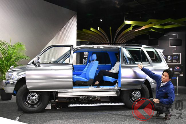 アイシンは、今回のJMS2025の展示に合わせて本車両を調達したといい、古いクルマをベースにすることで安全などに関する議論も社内で実際にあったとのことですが、「ワクワクする未来」「愛着のある今の愛車を長く大事に乗り続ける」を重視するコンセプトに則って採用されたとのこと。