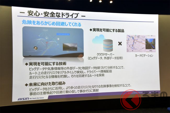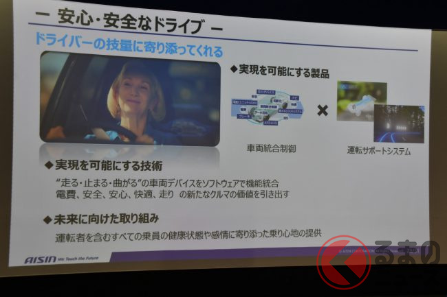 また実際に目に見える機能だけでなく、ビックデータや気象情報など外部データと地図データを紐づけて分析することで走行リスクを回避するルートを選んだり、電動ユニットやブレーキなどの車両統合制御と運転サポートシステムを組み合わせて、ドライバーの技量に寄り添ってくれる安心安全なドライブを実現するなど、アイシンがもつ様々な製品や技術が組み合わされることで提供できる「新たな移動価値」がこの1台に詰まっています。