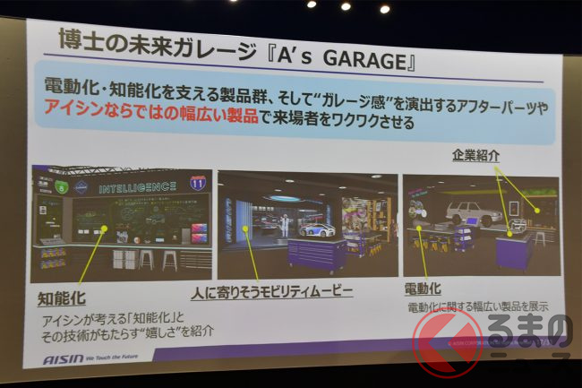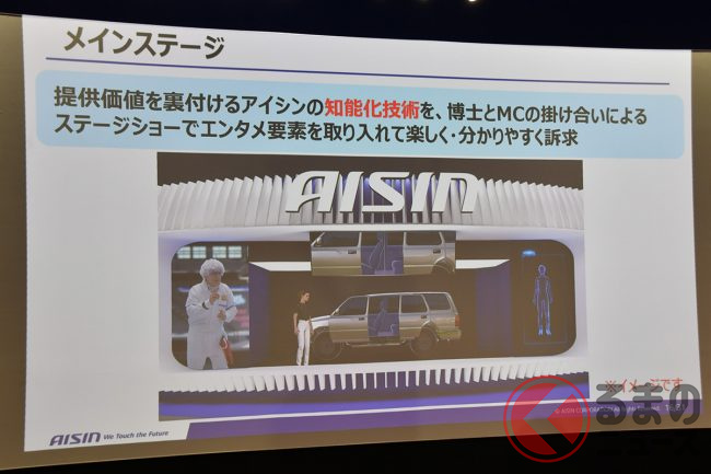 会場のメインステージでは、未来からやってきた“アイシンの博士”が、同社の知能化技術で安心、快適、便利になった自身の愛車(次世代モビリティ)を紹介します。知能化技術を搭載した「博士の愛車」の実車デモンストレーションが1時間に2回のペースでおこなわれ、来場者に「心を動かす移動の未来」の体験をしてもらうとのことです。