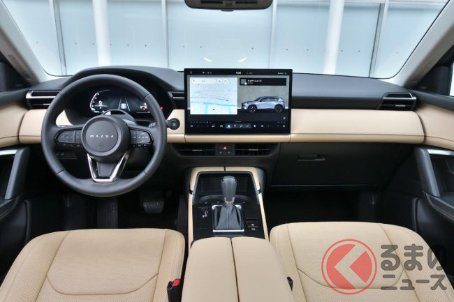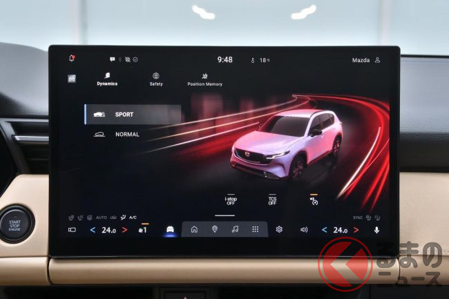 そして新型CX-5に関して筆者がもうひとつ感じたこと。それは、インターフェイスの大革命です。マツダがあれだけこだわっていた「タッチパネルではなく物理スイッチへのこだわり」と「視認性のために遠くへ置いたモニター」をやめ、ついに物理スイッチを大幅に廃止しつつ大きなディスプレイ(12.9インチもしくは15.6インチ)をドライバーの近くへ置き、タッチパネル操作への大転換を図ったのですから。