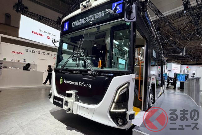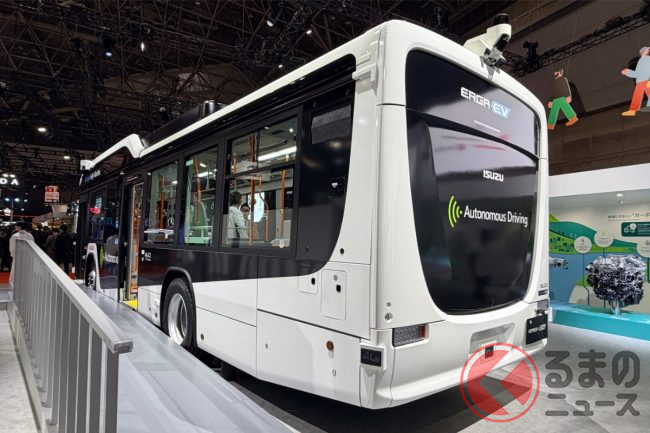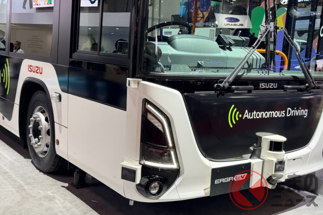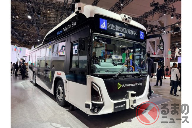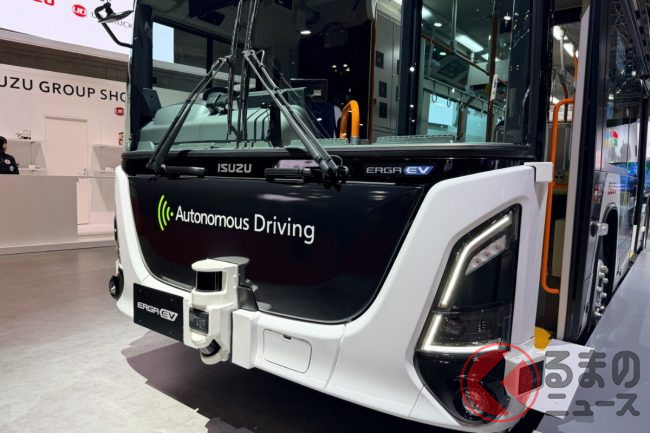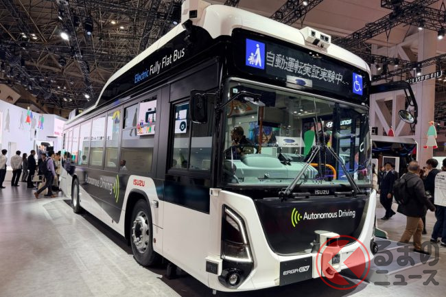 いすゞは2025年10月29日、「ジャパンモビリティショー2025」のプレスデーにおいて、国内初のBEVフルフラット路線バスをベースにした「エルガEV 自動運転バス」を世界初公開しました。