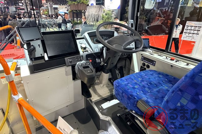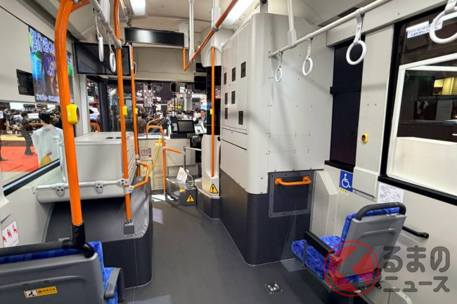 いすゞが「エルガEV 自動運転バス」を世界初公開! “段差ゼロ”のフルフラット×「自動運転」の“静音モデル”! 新時代の「大型路線バス」をJMS2025で披露
