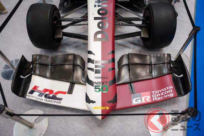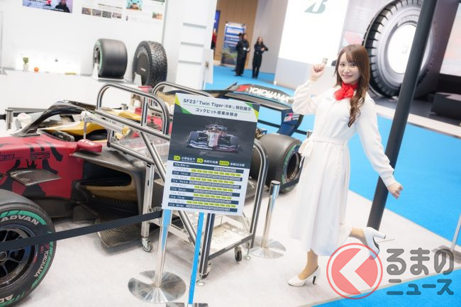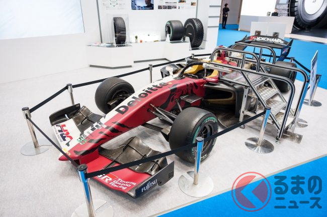 ジャパンモビリティショー2025の横浜ゴムブースには、まず正面の目立つ場所に日本最高峰のフォーミュラレースであり、世界的にも「F1の次に速い」と言われるスーパーフォーミュラのマシンが置かれていて興味をそそります。