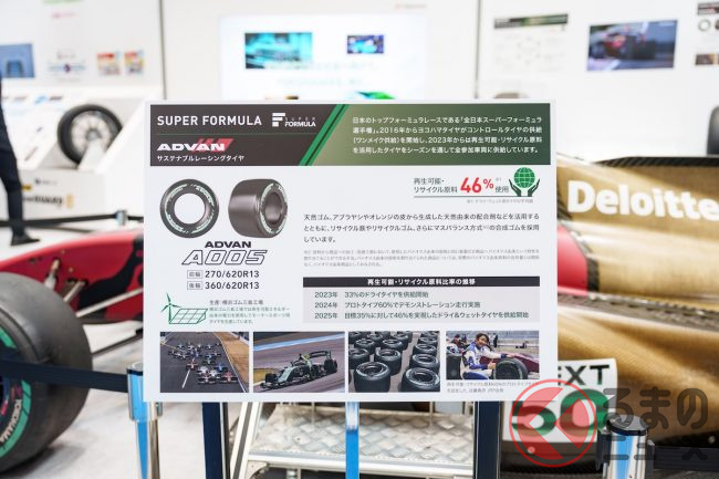 横浜ゴムの「ジャパンモビリティショー2025」ブースでは、スーパーフォーミュラの実車を使用した子ども向けのコックピット乗車体験や、再生可能素材を多用したタイヤなどを展示し、“脱炭素社会に挑むタイヤメーカーの本気”を体感できる出展内容となっていました。