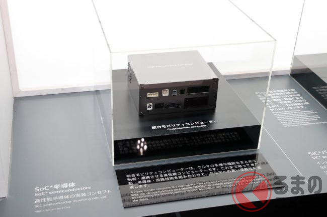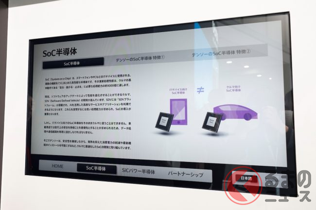 林社長は、クルマの高度な運転支援や自動運転には、高い演算能力に加え、低消費電力性能や機能安全、耐環境性などの信頼性を持った「SoC」が求められると指摘。デンソーが半導体メーカーとして培ってきた知見を生かし、オリジナルSoC、さらに領域横断的な「統合モビリティコンピューター」の開発を進めていると説明しました。
