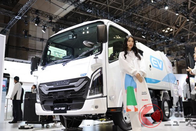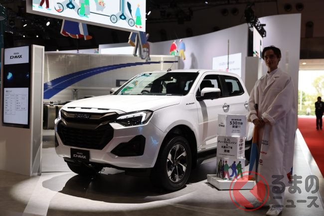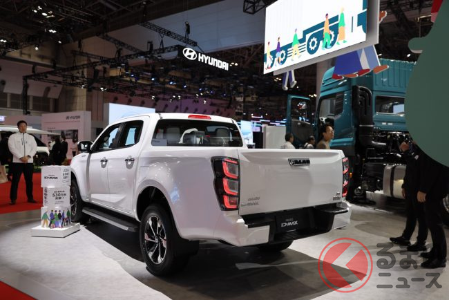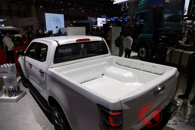 小型トラックでは、BEVトラックの「エルフEV塵芥車(じんかいしゃ)」とピックアップトラックの「D-MAX」を展示。中でも、「エルフEV塵芥車」は極めて現実的かつ日常生活に直結する車両として要注目です。1日の走行距離も少なく、街中を低速で走行し静粛性が求められる塵芥車(ごみ収集車)は、EVトラックと高い親和性を持ちます。