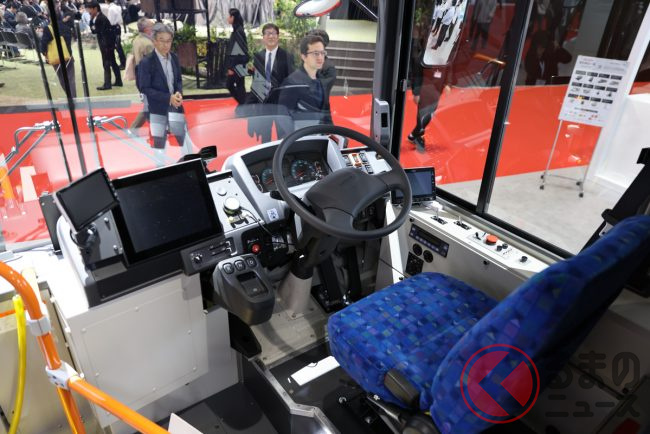 大きな特徴は、エルフEVの特装車向けシャシーをベースとしつつ、塵芥車としての架装はエンジン車と変わらないということです。ブースのスタッフは「BEVが普及するまでしばらくはエンジン車とBEVが並行して使用される現場で、パワートレインによって塵芥車の操作が異なると混乱を招くため」と説明しています。