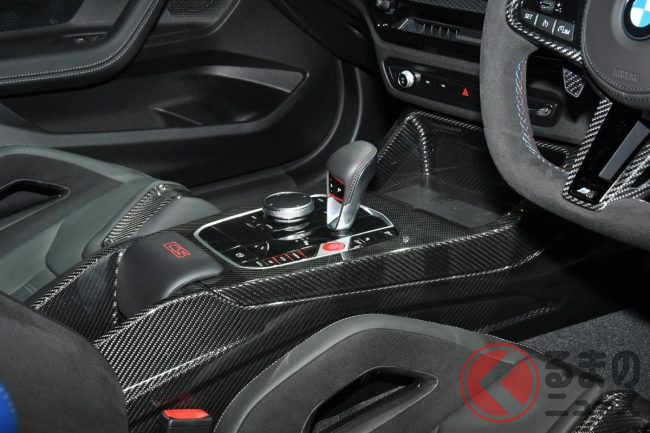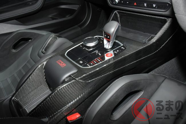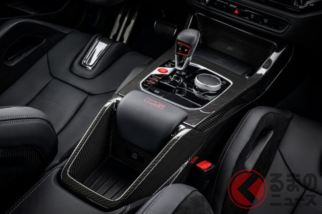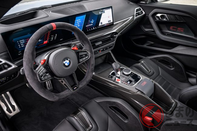 インテリアはM専用装備で統一され、センターマーク付きのアルカンターラステアリング、CFRP製センターコンソール、Mカーボンファイバー・トリムなどを採用。前席にはMカーボンバケットシート、センターコンソールには“CS”ロゴイルミネーションが配され、レーシングマインドを強く感じさせる空間に仕上げられています。