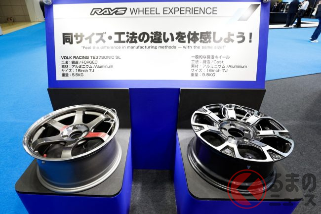 レイズが「ジャパンモビリティショー2025」に出展し、同社を象徴するVOLK RACING TE37からTOYOTA GAZOO Racingが使用するレーシングホイールまで、さまざまな展示をしています。ホイールの重さ比較では、大きな見た目とは裏腹に、実はレース向けの方が市販車向けよりも軽いことも体感できます。