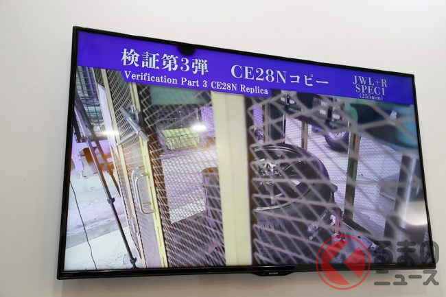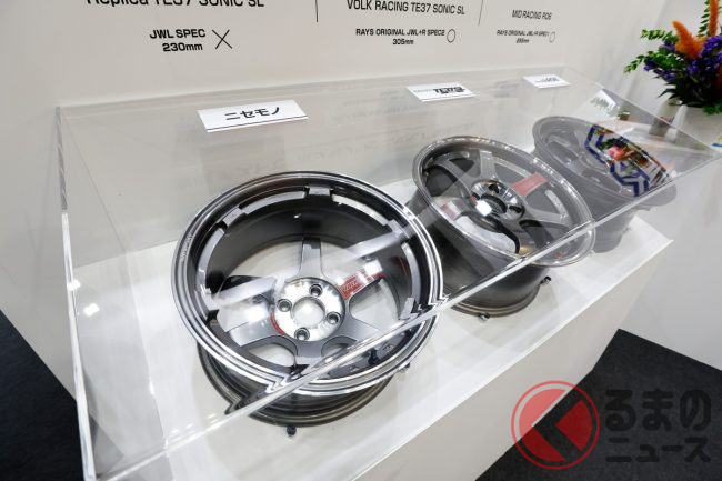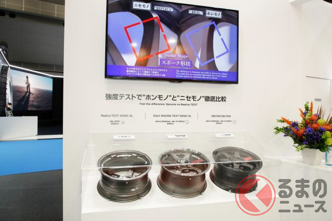 ブースでは、「ホンモノ」と「ニセモノ」の強度差を示す比較が展示され、VOLK RACING TE37のレプリカ(ニセモノ)、そして正規品のTE37、さらに、マルカサービスのMIDが展開する鋳造ホイール、MID RACING R06(いずれもホンモノ)の3種類を対象に衝撃試験を実施した結果を紹介しています。