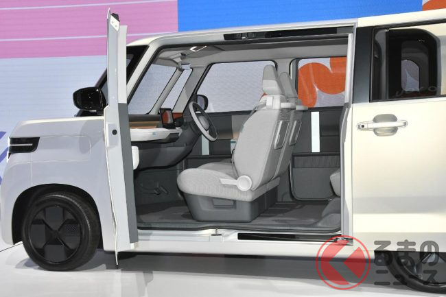 この疑問について、JMS2025のダイハツブースにて、Kビジョンの担当デザイナーに話を聞いてみたところ、「Kビジョンはあくまでも“未来の軽”を提案したものであり、特定の何かを意識したデザインではありません」という回答でした。