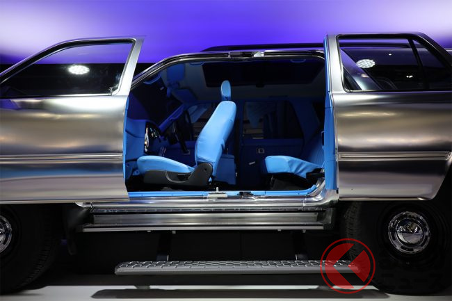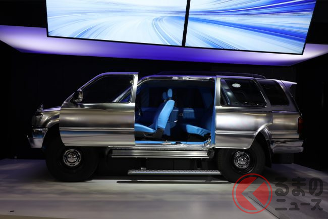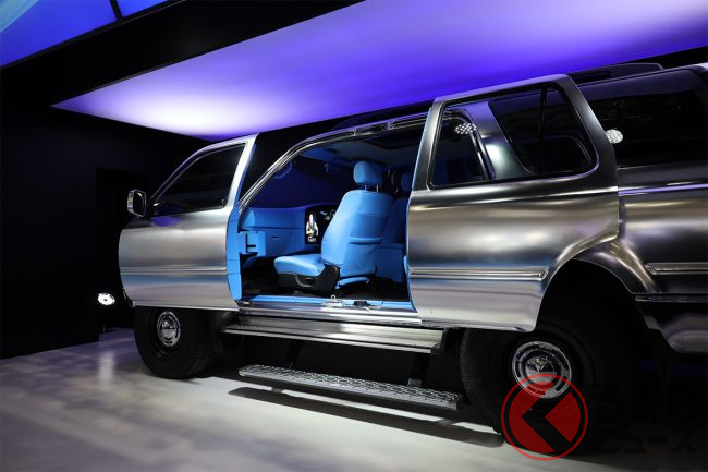 懐かしさと新しさが融合した「博士の愛車」は、1990年代のトヨタ「ハイラックスサーフ」のMT仕様車をベースとしながらも、「リンク式パワードアシステム」と呼ばれる大胆なスライドドア構造や、電動サイドステップ、電動グリルシャッター、前後のアクティブスポイラーといった最新の機構が備わっています。