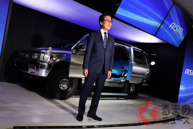 アイシンが、東京ビッグサイト(東京都江東区)で2025年10月30日~11月9日(一般公開は10月31日から)に開催されている「ジャパンモビリティショー2025」に出展しています。30日、ブースがメディア向けに公開され、トヨタ「ハイラックスサーフ」のMT仕様車をベースにした「博士の愛車」などがお披露目されました。