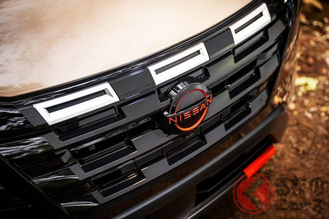 フロントマスクは、日産の新世代ファミリーフェイスを採用。ヘッドライトとグリルを一体化させた台形のデザインに、六角形の穴が整然と並ぶフラットなグリルを組み合わせた、未来的な“ツブツブ顔”が特徴です。次期「エルグランド」にも共通するデザイン言語で、より洗練された印象を与えます。