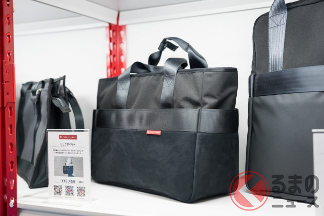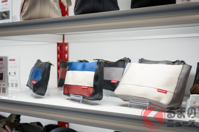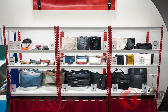 ブースの外側には、シートベルトの端材を素材に用いたバッグ類が並んでいます。これは、東海理化のアップサイクルブランド「Think Scrap」の製品です。