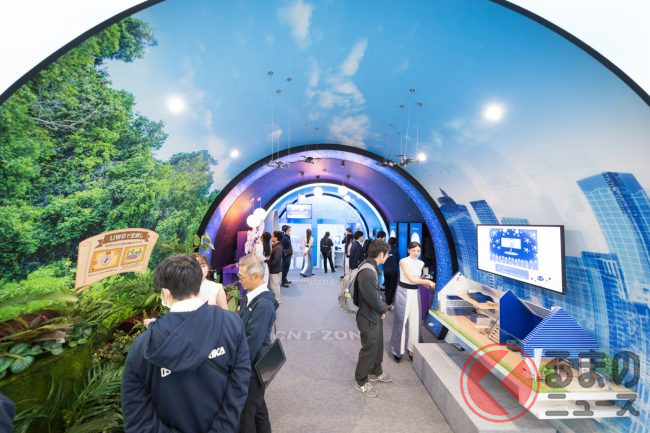 ステアリングホイール、パワーウインドウスイッチ、シフトレバーなどを生産する大手部品メーカーである東海理化のブースコンセプトは、「技術でつなぐ、豊かな社会へのトンネル」です。このコンセプトの通り、ブースは円すいを横に置いて埋め込んだようなトンネル型となっており、会場で大きな注目を集めています。