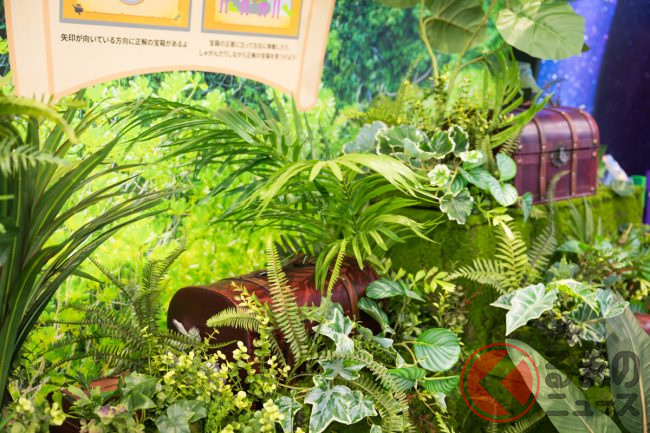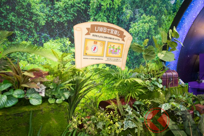 まずは電波技術を紹介する「UWB(ウルトラワイドバンド)ゾーン」で、2つのゲームが楽しめます。そのひとつが宝箱探しです。タブレット画面に表示された矢印が指し示す先に宝箱があることがわかるアトラクションで、「GPS衛星の電波が届きにくい屋内などでも、高精度で位置や距離を測定できるUWB技術」を生かしています。UWB技術を用いることによって、配送が困難だった場所へドローンを使って荷物の配達などが可能となります。