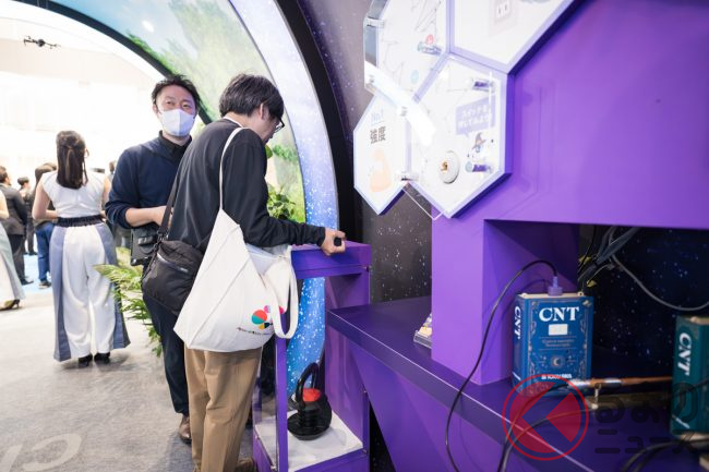 次は材料応用技術の「CNT(カーボンナノチューブ)ゾーン」です。ここでは、カーボンナノチューブを用いて温度差から電気を生み出す「熱電発電技術」や、カーボンナノチューブの特性を生かした実験を楽しめます。