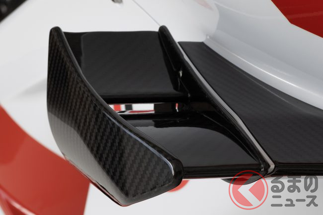 スポーティな走行性能を支えるため、外装はカーボン製で、空力性能を最適化する可変式のウイングレットが装備されています。このウイングレットは、160km/hまではダウンフォースを生み出し、160 km/hから200 km/hの速度域ではドラッグを最小限に抑えるために水平位置へと調整されます。さらに、ブレーキ作動時には最大のダウンフォースを提供するように設計されています。