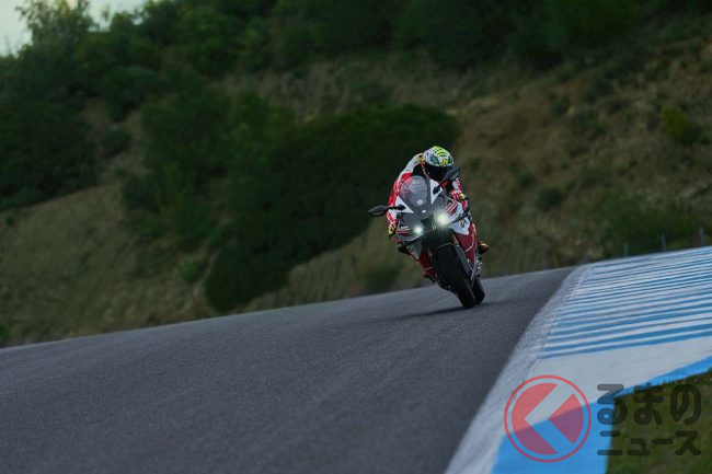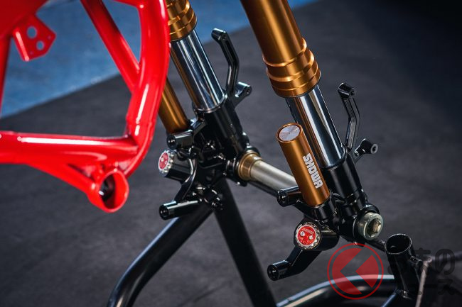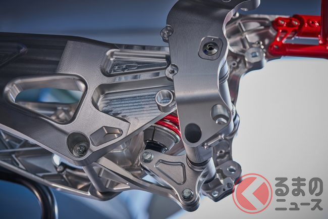 足回りには、マルケジーニ製の7本スポーク鍛造アルミニウムホイールやブレンボ製ブレーキシステムといった高性能パーツが採用されています。サスペンションは、フロントにSHOWA製の43mm BFFフロントフォークを、リアには路面追従性を追求して垂直に配置されたBFRC liteリアショックを備えています。