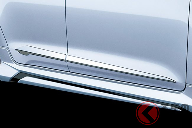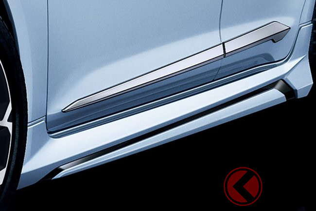 フロントスポイラーとサイドスカートを中心とした「エアロパーツ」で一体感を高め、ブラックアウトとメッキ加飾でロー&ワイドな印象を強調します。