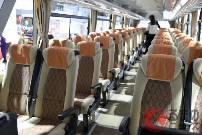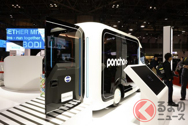 ブース正面には、後述する小型BEVトラック「デュトロZEV」をベースにした小型BEV路線ノンステップバスのコンセプトカー「ポンチョドット」を初展示。かわいらしい顔が印象的なポンチョドットは、全長4.85m・全幅1.8mという運転しやすいサイズで乗車定員11人を実現しました。跳ね上げ式座席や大きく開く後部ドアを活用して荷物を運べるため、送迎から荷物の輸送まで、これ一台で地域内の複数輸送をひとつにまとめることを可能としています。