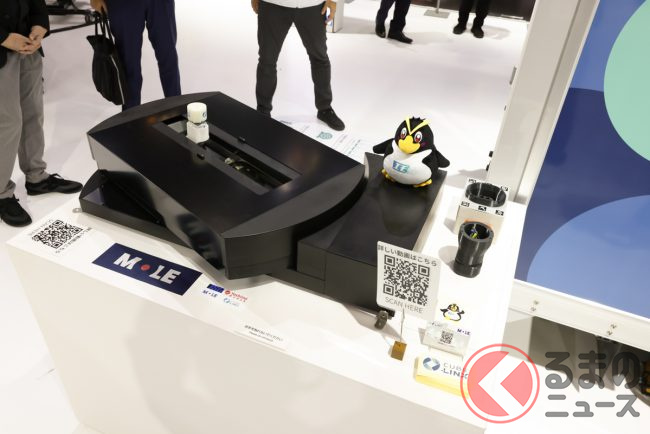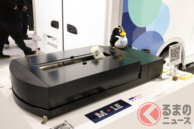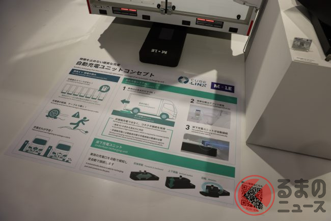 この中で特に興味深かったのが、デュトロ Z EVと同時に展示されていた「自動充電ユニットコンセプト」です。商用EVを運用する上での悩みは、車両を置き場に充電器を設置するスペースがないこと。駐車の際、充電器の破損やドライバーや従業員がケーブルでつまずく危険性もあります。