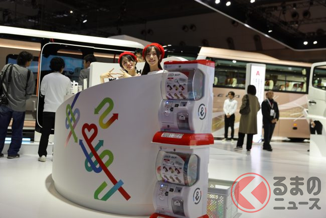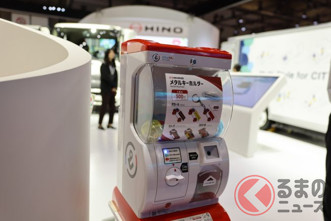 また、受付脇にはトラックをかたどったかわいいメタルキーホルダーのガチャも500円で販売しています(QRコード支払い可能なので小銭がなくてもOK!)。日野ブースでは6台すべてに乗車が可能ですので、ぜひ普段の生活ではなかなか触れる機会がないトラックやバスの迫力を楽しんでください。