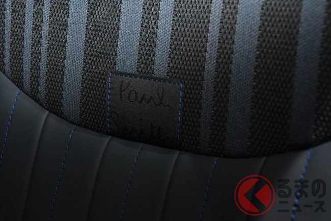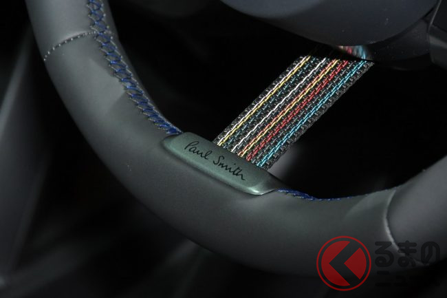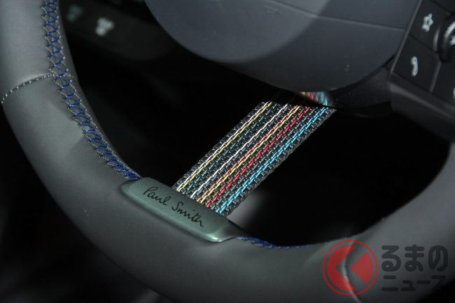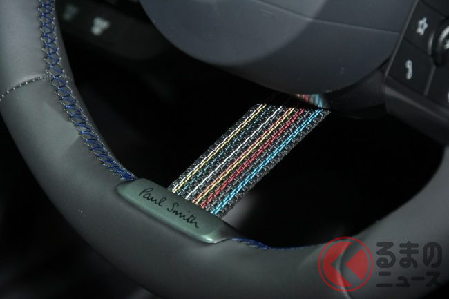 エクステリアには、ポールスミスならではのアクセントも随所に施されています。有名なマルチカラーの「シグネチャー・ストライプ」が運転席後部のルーフサイドにデザインされ、この特徴的なストライプ柄はインテリアにも大胆に展開されています。