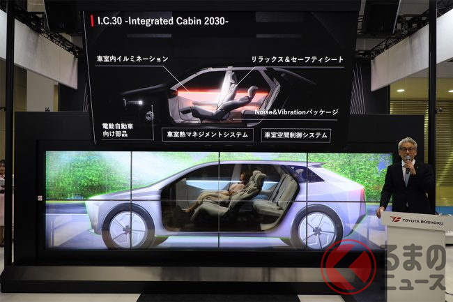 トヨタ紡織が、東京ビッグサイト(東京都江東区)で2025年10月30日~11月9日に開催されている「ジャパンモビリティショー2025」に出展し、次世代キャビン「I.C.30」をはじめとする最新の技術を公開しています。