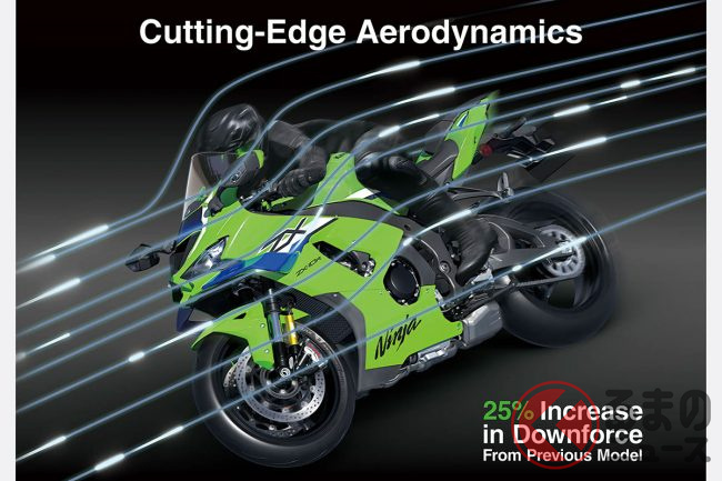 2026年モデルの大きな特徴は、大型ウィングレットを取り入れた新しいエアロパッケージです。カワサキのエンジニアが揚力と抗力の一得一失を慎重に検討して設計したこの新ウィングレットは、前面面積が増加するものの、ダウンフォースの発生量を約25%向上させることを実現しています。