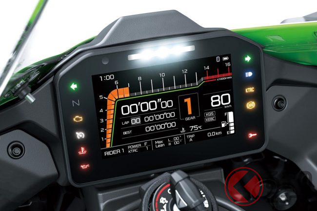 その結果、高速域でのダウンフォースが大幅に増え、コーナリング時のフロントフィーリング向上とラップタイム短縮に寄与します。この大型ウィングレットは、コンパクトなプロジェクター/リフレクターハイブリッドヘッドライトや再配置されたラムエアインテークと共に、2026年モデルの「新しい顔」を作り出し、Ninjaファミリーの力強いイメージを一層際立たせています。