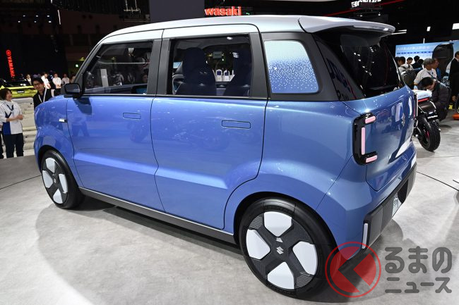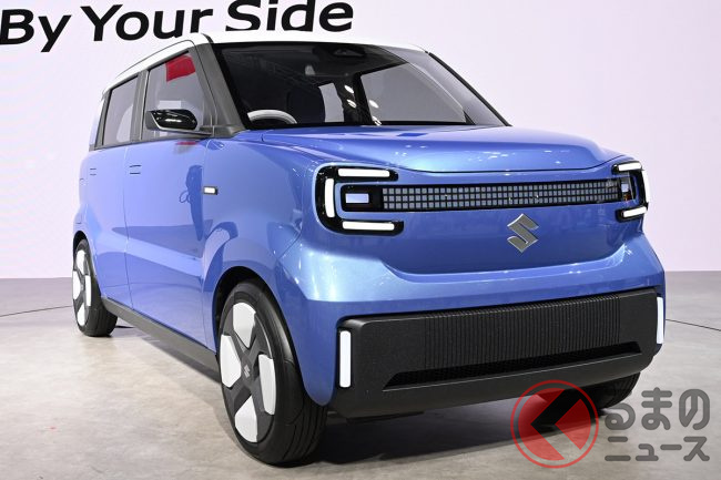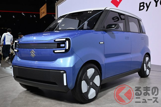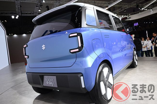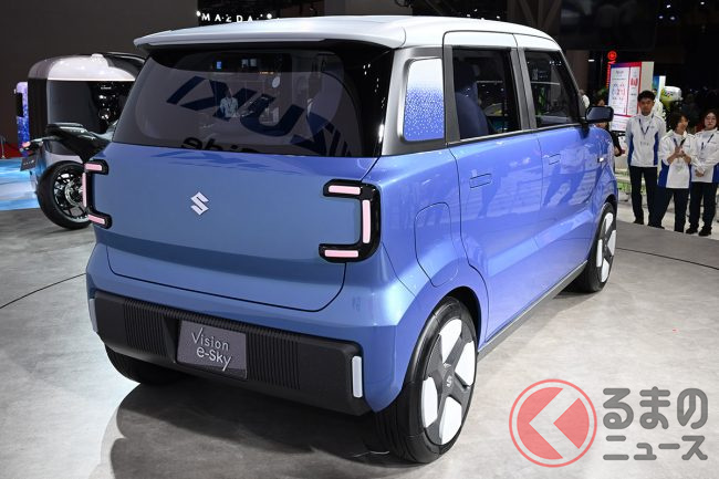 スズキが新型「“4人乗り”軽ワゴン」世界初公開! ツルっとフロントマスク×カクカク箱型ボディが斬新! 「ワゴンR」より背が低い“新たな生活の足”「ビジョン e-スカイ」とは!