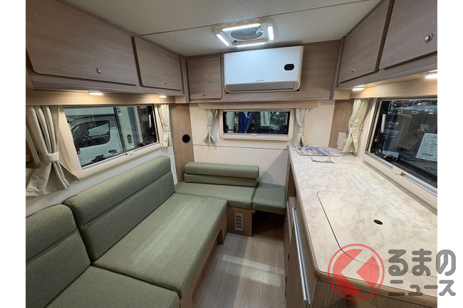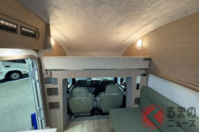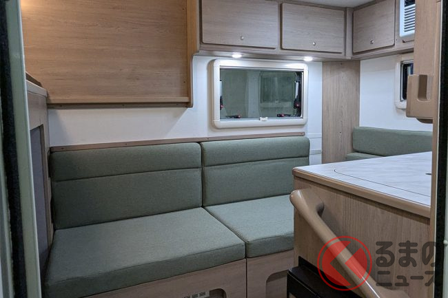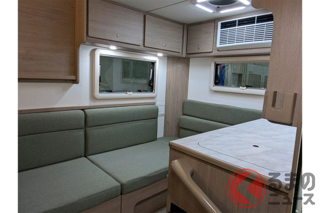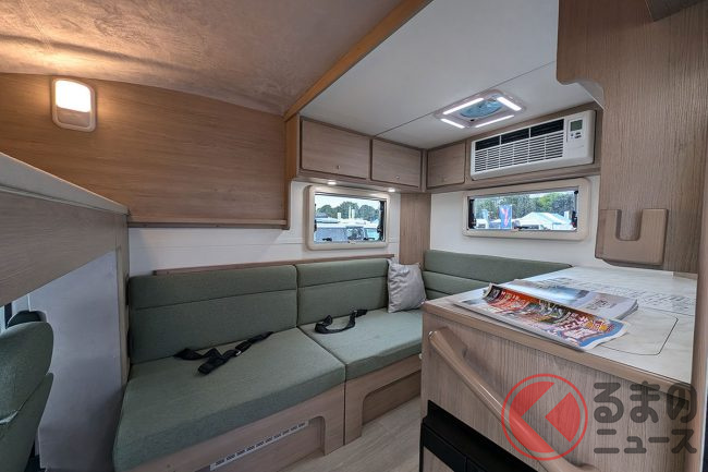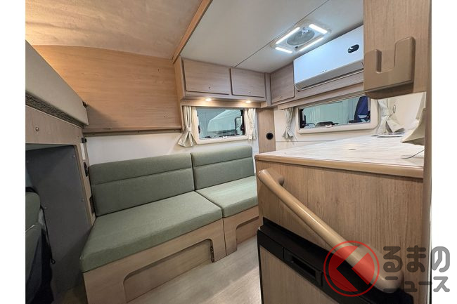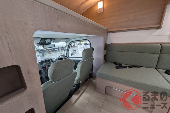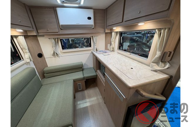 会場の担当者は「例えば身長170cmの男性でも天井に触れず、自然な姿勢で室内を移動できます」と語り、軽キャブコンとは思えない開放感がある設計が特徴です。