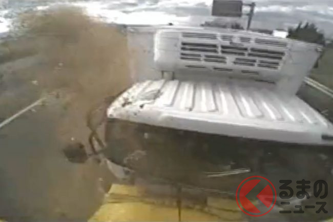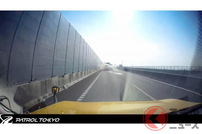 トラックの部品が弾け飛ぶとともに、衝突の強さを物語る轟音がトンネルにこだまします。NEXCOのパトロールカーに乗る隊員も、声にならない叫びを上げ、驚きます。